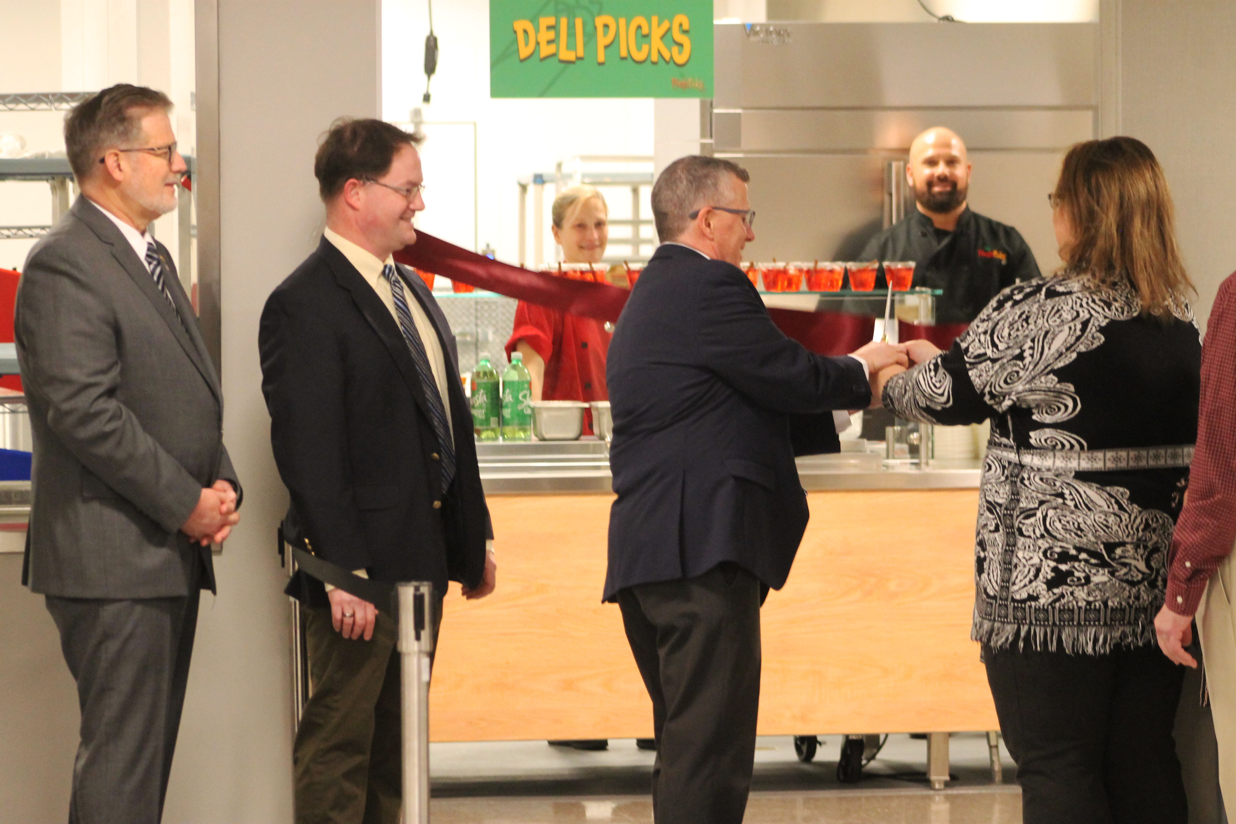 PHOTO: State Rep. Mark Anderson (R-Granby) looks on as Building Committee Chairman, Thomas P. Proctor, Granby Memorial High School Principal, Michael Dunn, and Granby Town Manager, Erica Robertson, cut the ribbon to the school’s new kitchen and cafeteria.