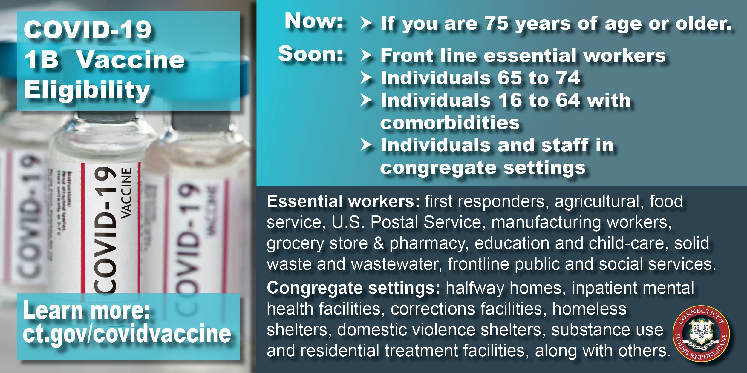 Distribution for Phase 1b will begin with individuals 75 and older and will ultimately include individuals 65 and over, those ages 64-16 with certain pre-existing conditions, frontline essential workers, and individuals in congregate settings.