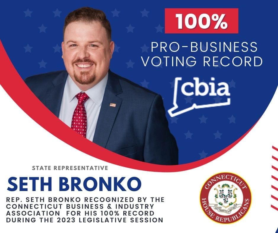 HARTFORD – Rep. Seth Bronko (R-Naugatuck) received a 100% voting record from the Connecticut Business and Industry Association (CBIA), which recently released their scorecards for lawmakers, rating each on their support for CT business, jobs, and economic growth.