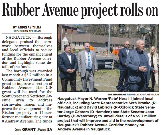 “We took the opportunity to proudly stand near the corner of Rubber Avenue to share details of the project’s scope, which will include new sidewalks to help keep people safe and connect area businesses,” Rep. Bronko said. “The project also is meant to connect with others in the area focused on spurring accessibility, safety and economic growth for all of Naugatuck.”