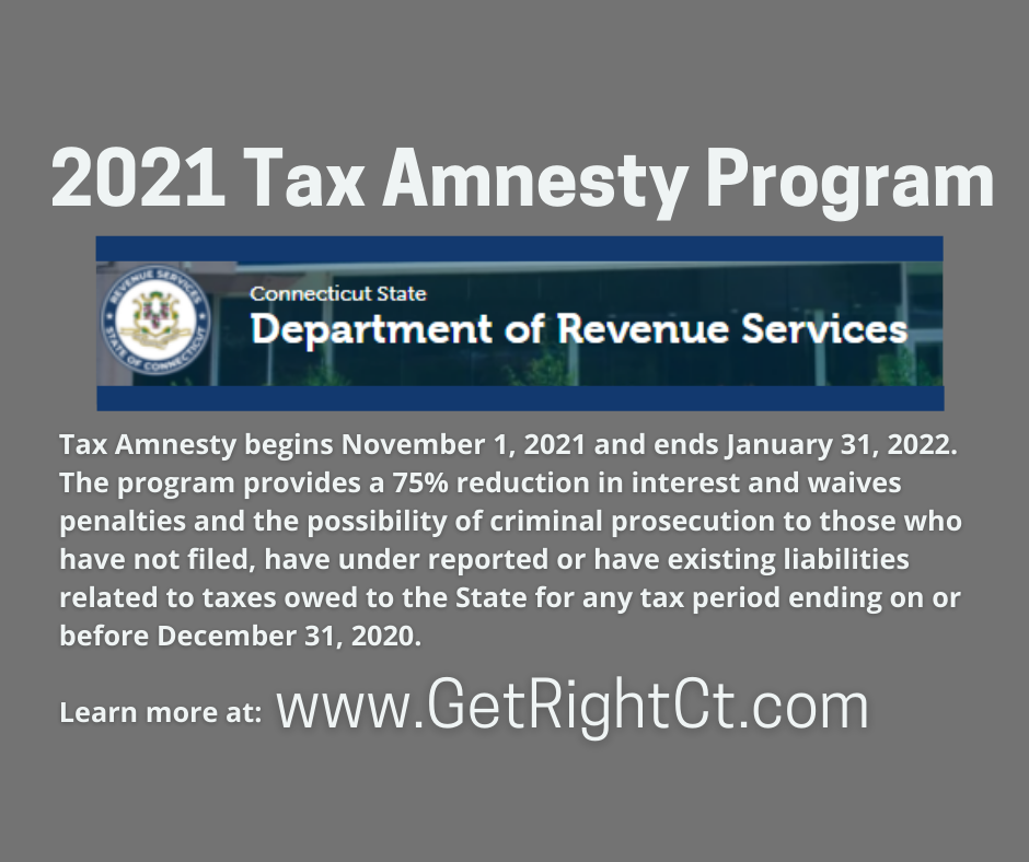 Hartford – The State of Connecticut has launched its 2021 Tax Amnesty program. To learn more about the program, you can visit GetRightCt.com. The program runs from November 1, 2021 through January 31, 2022. The program provides a 75% reduction in interest and waives penalties and the possibility of criminal prosecution to those who have not filed, have under reported or have existing liabilities related to taxes owed to the State for any tax period ending on or before December 31, 2020.
