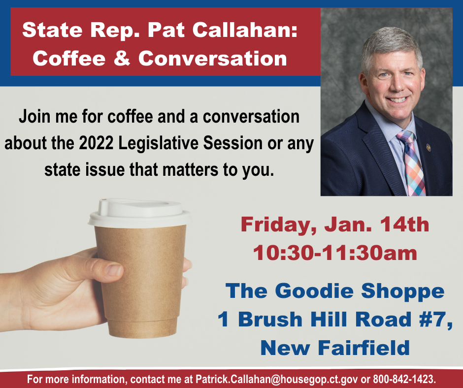 State Rep. Pat Callahan (R-New Fairfield) will be hosting Coffee & Conversation on Friday, January 14th. If you have any questions about the upcoming legislative session, or any comments or concerns about ongoing state issues, this is a great opportunity to discuss them with your state representative. Additional details are below: