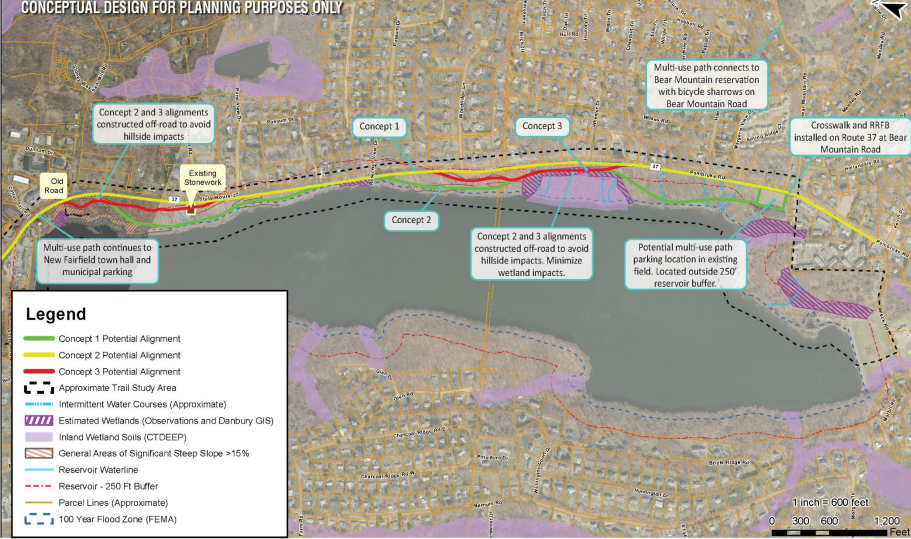 One proposed concept shows a path along the Route 37 right-of-way where feasible within the City of Danbury and closer to the reservoir north of Colonial Road, along with scenic overlooks throughout.