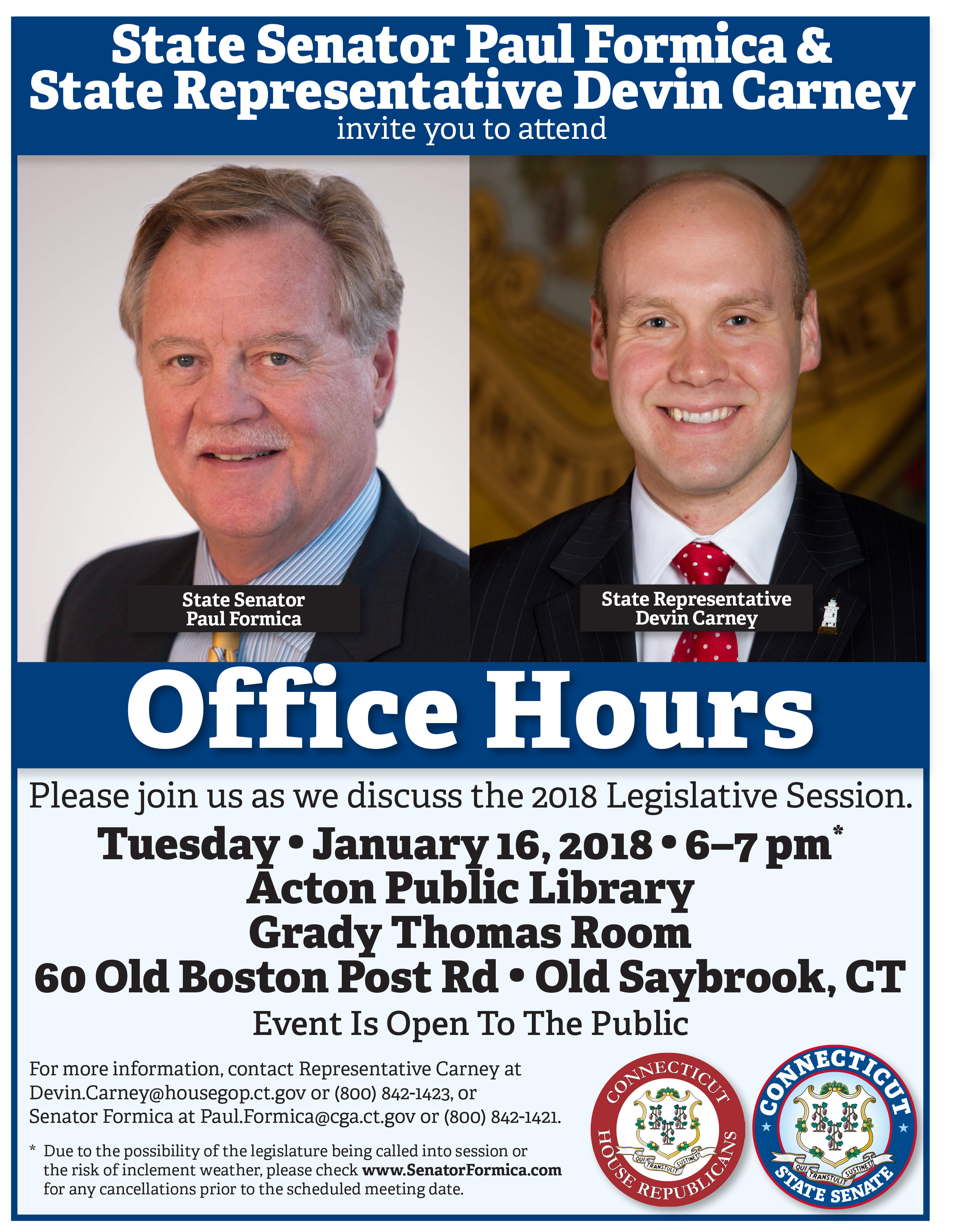Just a reminder, Senator Formica and I will be hosting pre-session office hours in Old Saybrook TONIGHT, January 16th, from 6-7PM at the Acton Public Library, 60 Old Boston Post Rd, Old Saybrook.