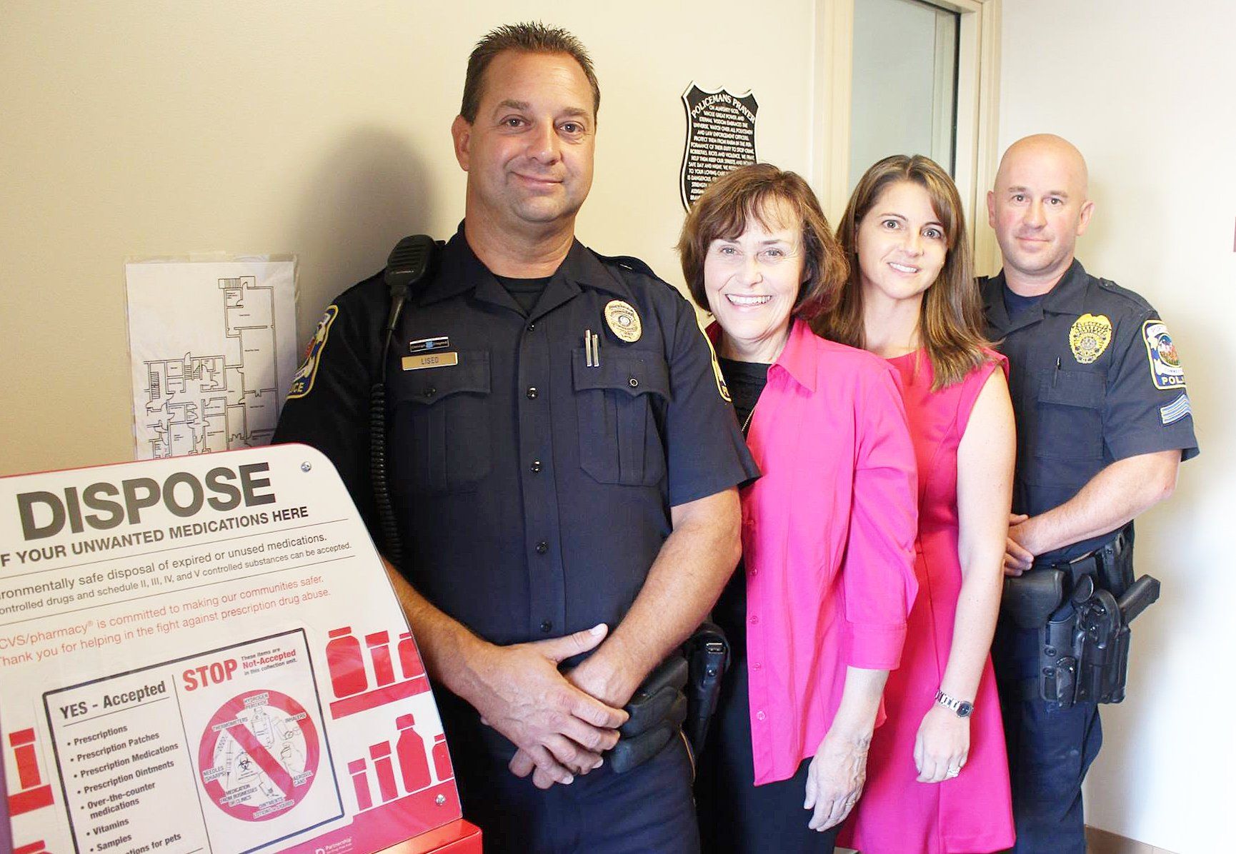 Photo: Portland Police Officer Paul Liseo, Portland First Selectwoman Susan Bransfield, State Representative Christie Carpino, and Portland Police Sergeant James Kelly are pictured in front of the drug return box.
