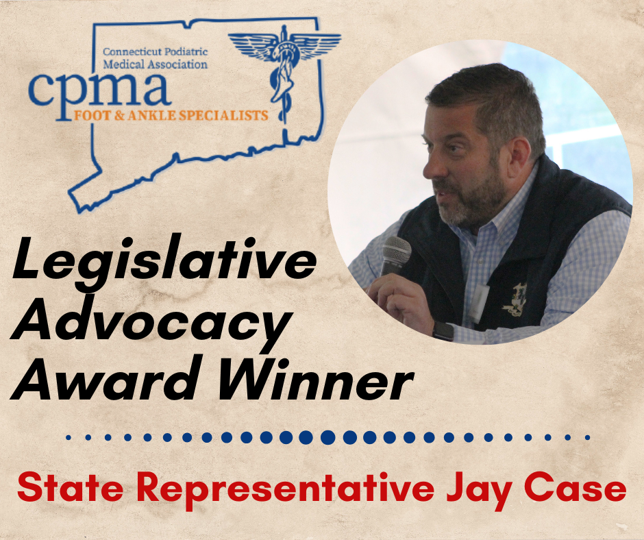 Winsted – The Connecticut Podiatric Medical Association (CPMA) recognized State Rep. Jay Case (R-Winsted) and presented him with the organization’s legislative advocacy award for his service in the 2020 regular and special sessions. The CPMA is an organization comprised of many of the state’s Doctors of Podiatric Medicine.