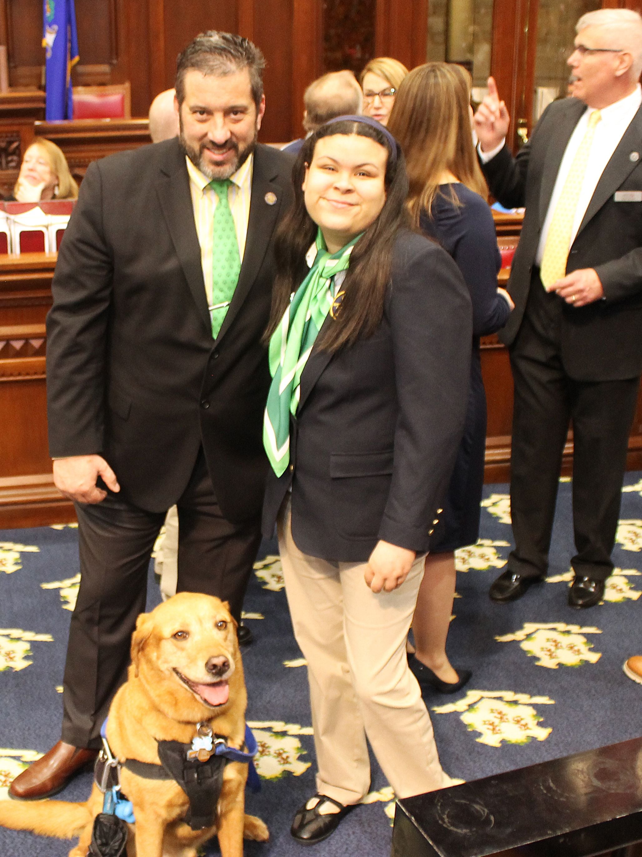 Hartford – State Representative Jay Case (R-Winsted) welcomed Karla Ferrer, who is an accomplished Special Olympics Connecticut (SOCT) athlete, to the House of Representatives on Wednesday, April 24th. The organization came to the Capitol to provide an opportunity for state legislators to meet with SOCT athletes and learn more about their activities both on and off the athletic field. Karla was joined by her family’s service dog, Mickey, who has been trained locally at ECAD (Educated Canines Assisting with Disabilities). According to Karla, Mickey has been with the family for six years and he has been critical in assisting her and her mother, Zoraya Irizarry, with their daily tasks.