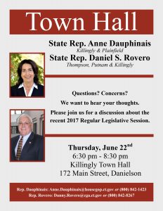 HARTFORD – State Representative Anne Dauphinais (R-44) and State Representative Daniel Rovero (D-51) are inviting Killingly residents to a legislative wrap-up on the General Assembly session which ended on June 7th.