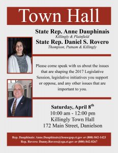 HARTFORD – State Representative Anne Dauphinais (R-44) will co-host a Town Hall with State Representative Daniel Rovero (D-51) on April 8th in Killingly, where constituents will have an opportunity to discuss all current legislative matters affecting the district.