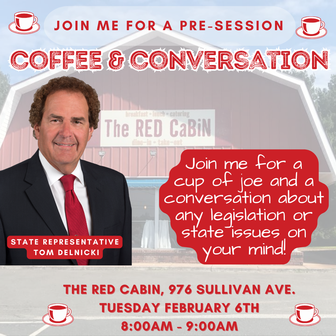 I will be hosting a pre-legislative session “Coffee & Conversation” on February 6th in South Windsor.