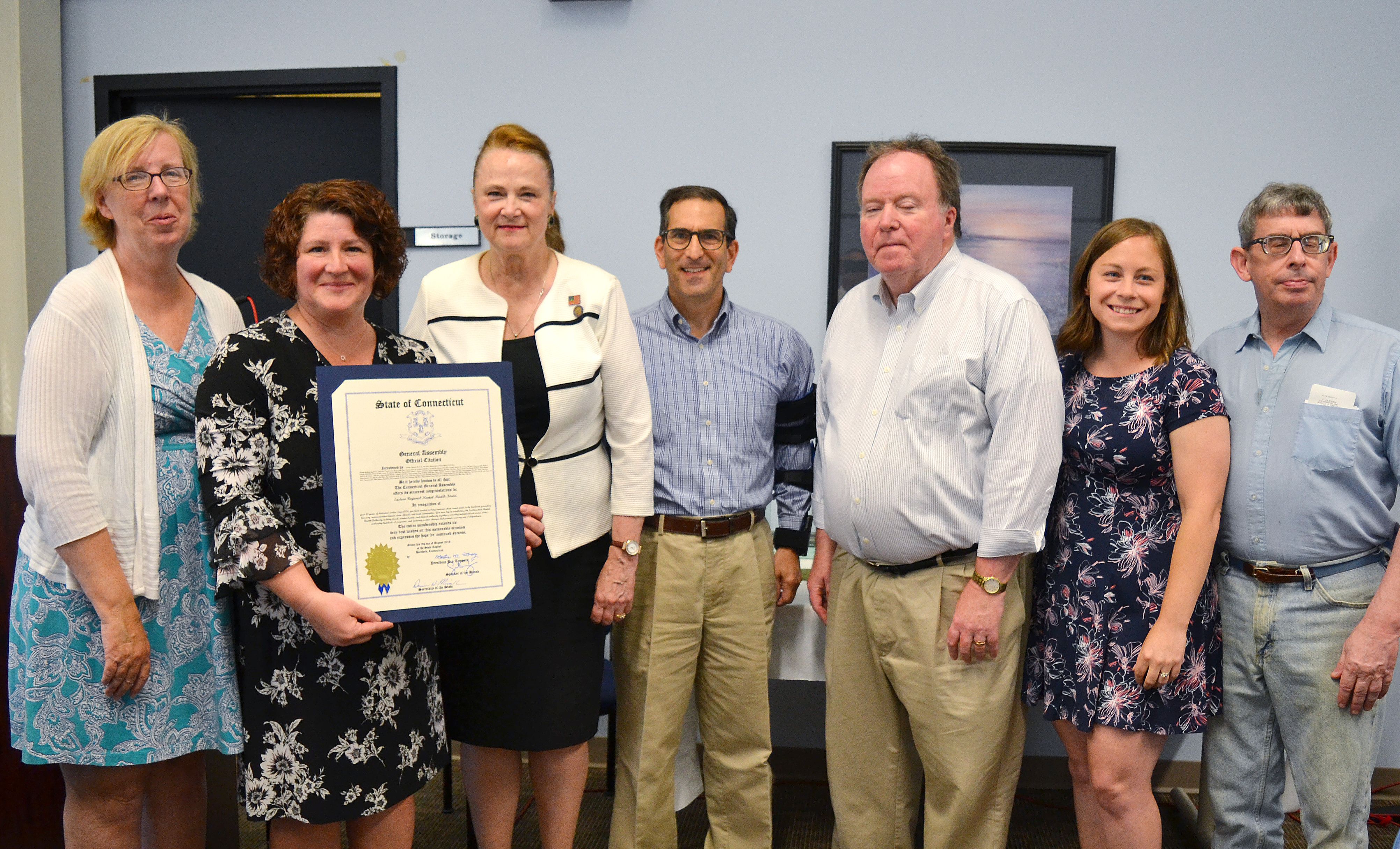 (L-R) Senator Cathy Osten, Deborah Walker, Acting Director of the ERMHB , State Representative Kathleen McCarty, State Representative Doug Dubitsky, State Representative Kevin Ryan, Kati Mapa, Former Executive Director, and ERMHB President, Howard Beatman.
