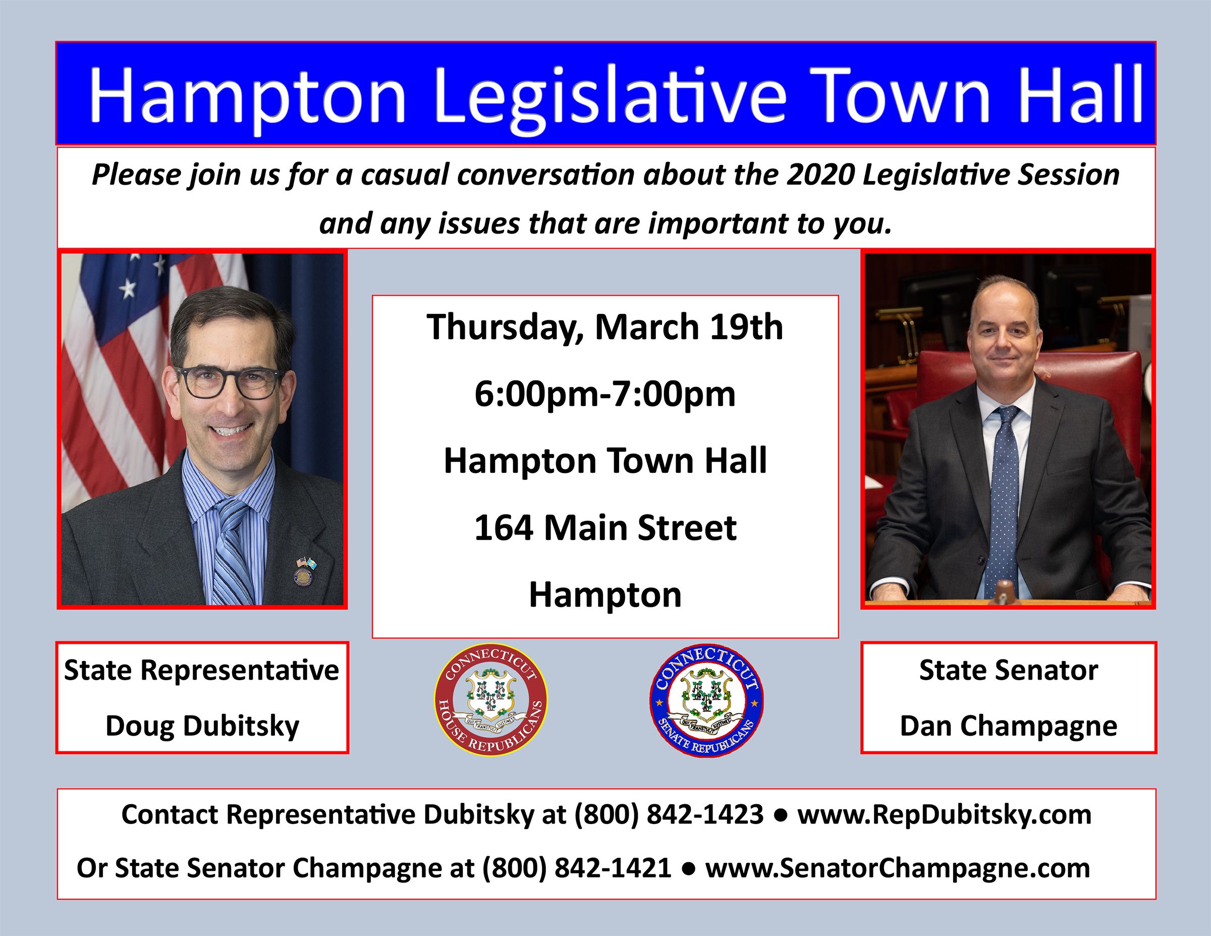 HARTFORD – State Representative Doug Dubitsky (R-47) and State Senator Dan Champagne (R-35) will be holding a joint legislative Town Hall at the Hampton Town Hall on Thursday, March 19, 2020.