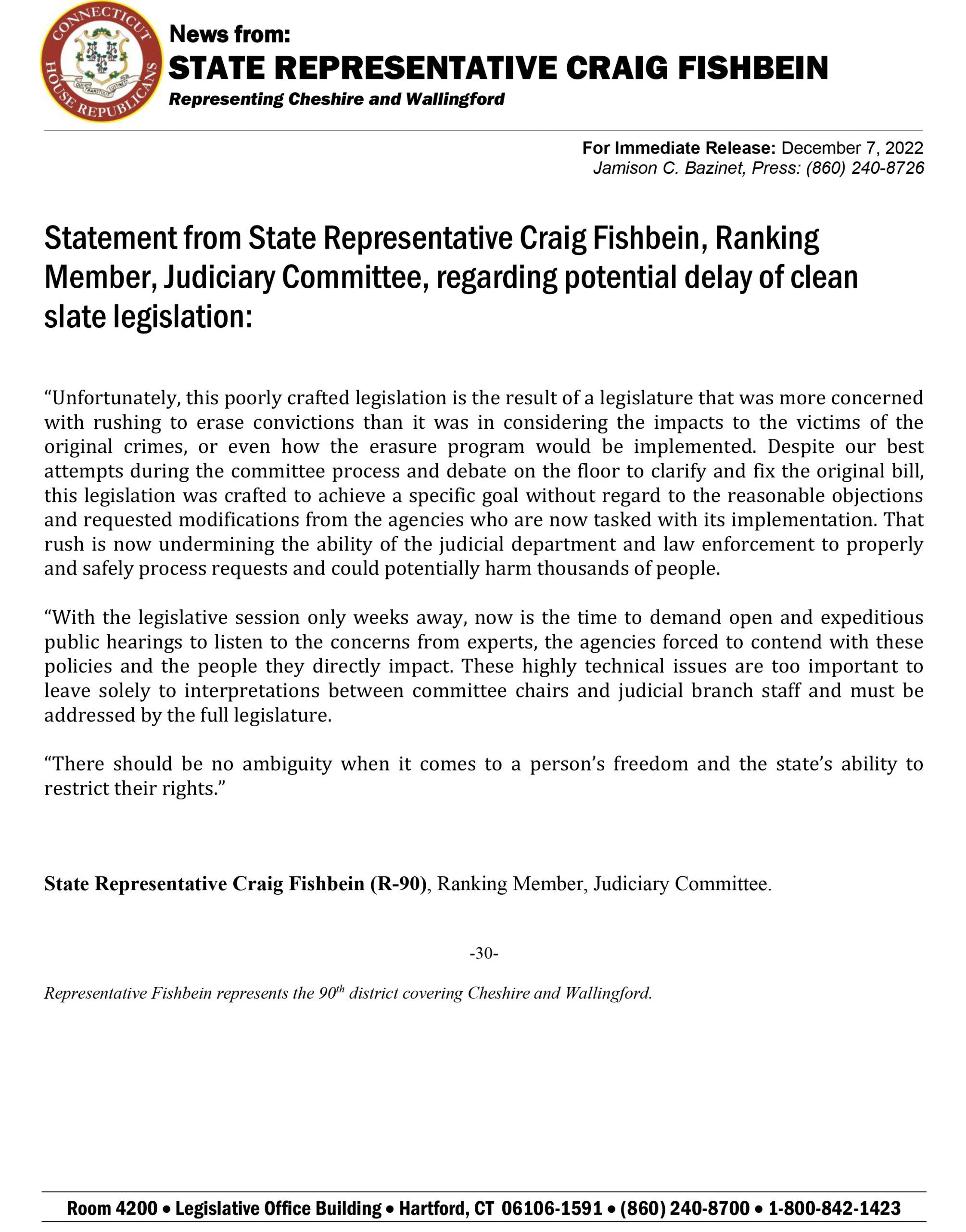Statement from State Representative Craig Fishbein, Ranking Member, Judiciary Committee, regarding potential delay of clean slate legislation: