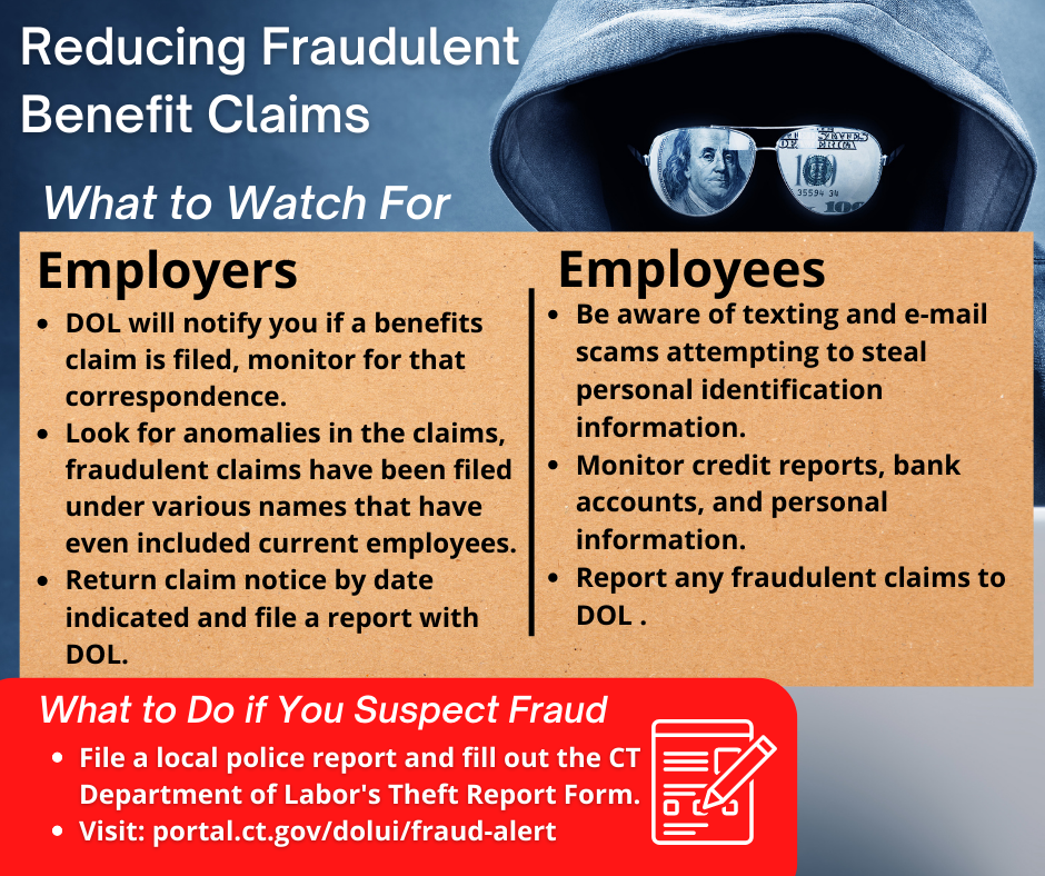 The uptick in fraudulent benefits claims is alarming. According to reports, two-dozen businesses have notified the Connecticut Business Industry Association about fraudulent claims. The DOL is also warning individuals to watch out for phishing scams through e-mail, social media, and text.