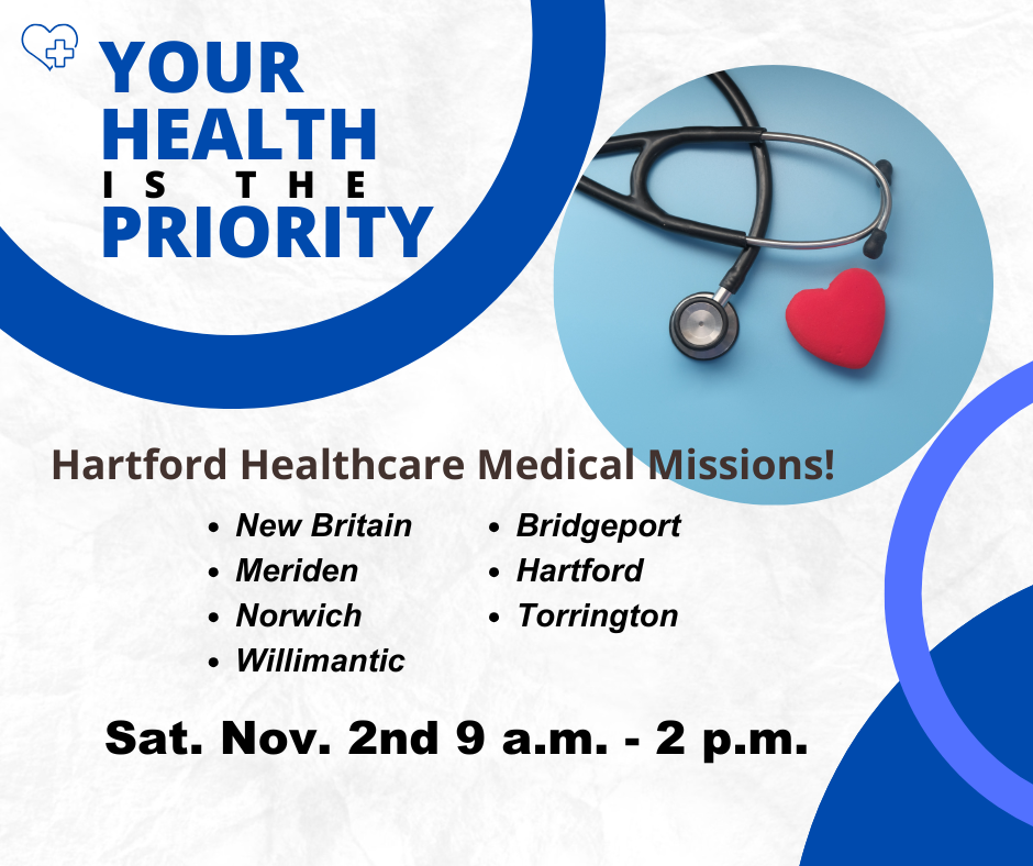 I just wanted you to know that on Saturday, November 2, from 9 a.m. to 2 p.m., Hartford HealthCare volunteers will offer medical exams, podiatry services and more to our most vulnerable communities at no charge and with no insurance required. The one-day mission also provides eyeglasses, winter coats, haircuts and other necessities.