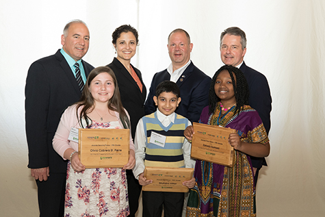 from left – Ron Araujo, manager of energy efficiency, Mary Sotos, deputy commissioner of DEEP, Rep. Craig Fishbein and Pat McDonnell, UI’s director of conservation load management, congratulated Olivia Cabrera St. Pierre, Mujtaba Ather and Zuhara Sumani for placing in the top three of the EESmarts Student Contest.