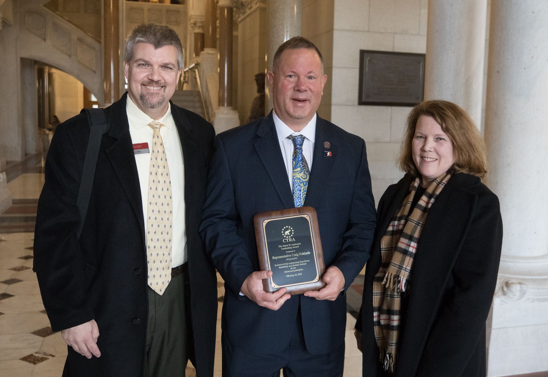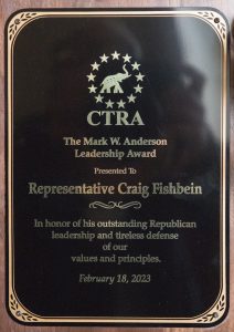 During a brief break during the legislative session, State Rep. Craig Fishbein was presented with the Mark W. Anderson Leadership Award from the Connecticut Republican Assembly. CTRA President Anne Manusky and First V.P. Mark Mnich were at the Capitol to present a plaque recognizing Rep. Fishbein’s continued efforts to make state government smaller and more efficient for the citizens of our state. According to their website, “CTRA encourages members to work with their local Republican Town Committees and allied groups to advance our values and move forward with our vision.”