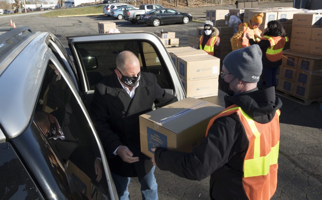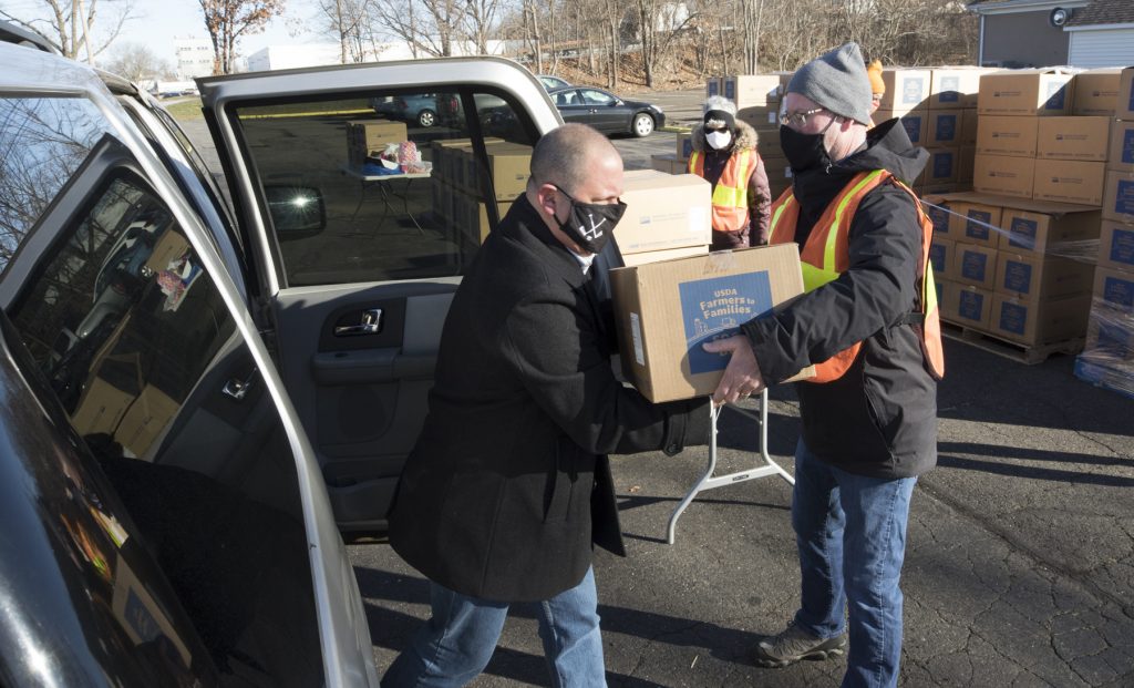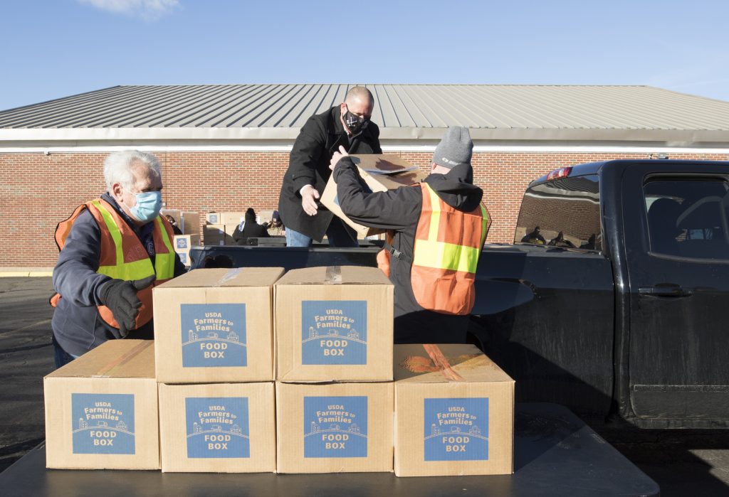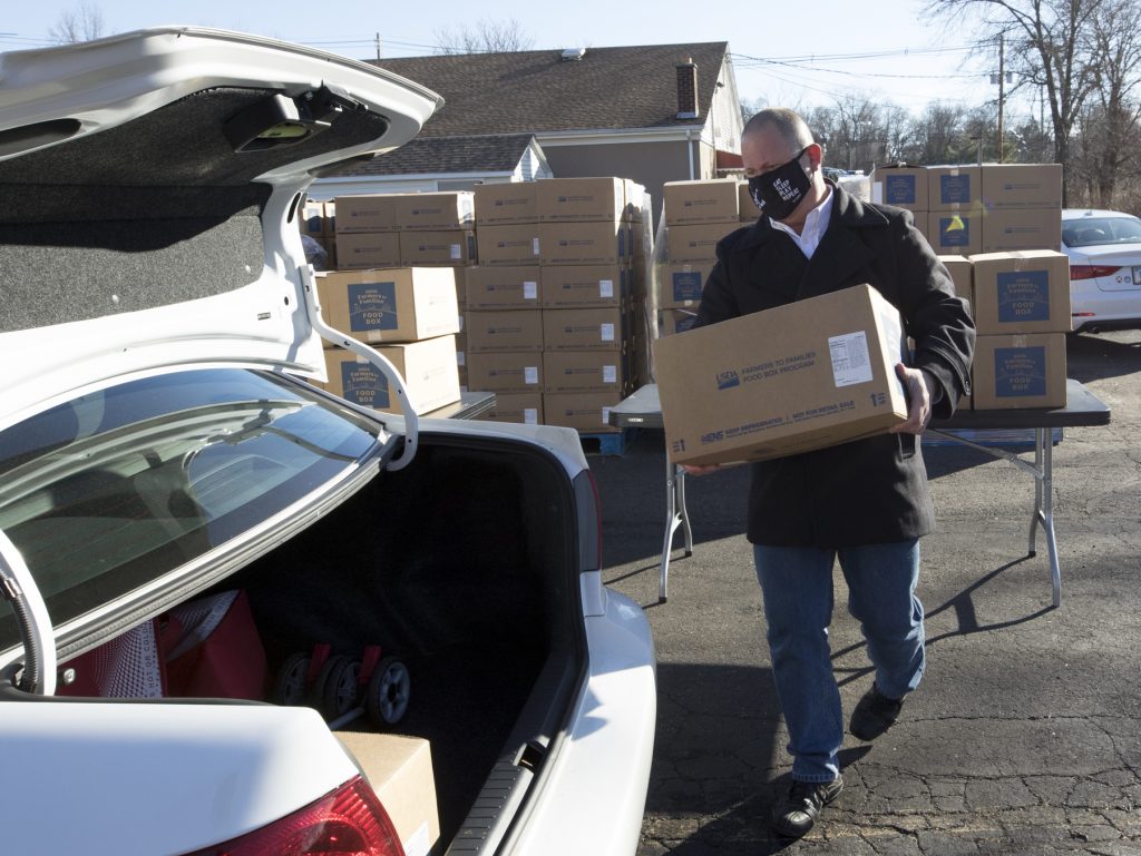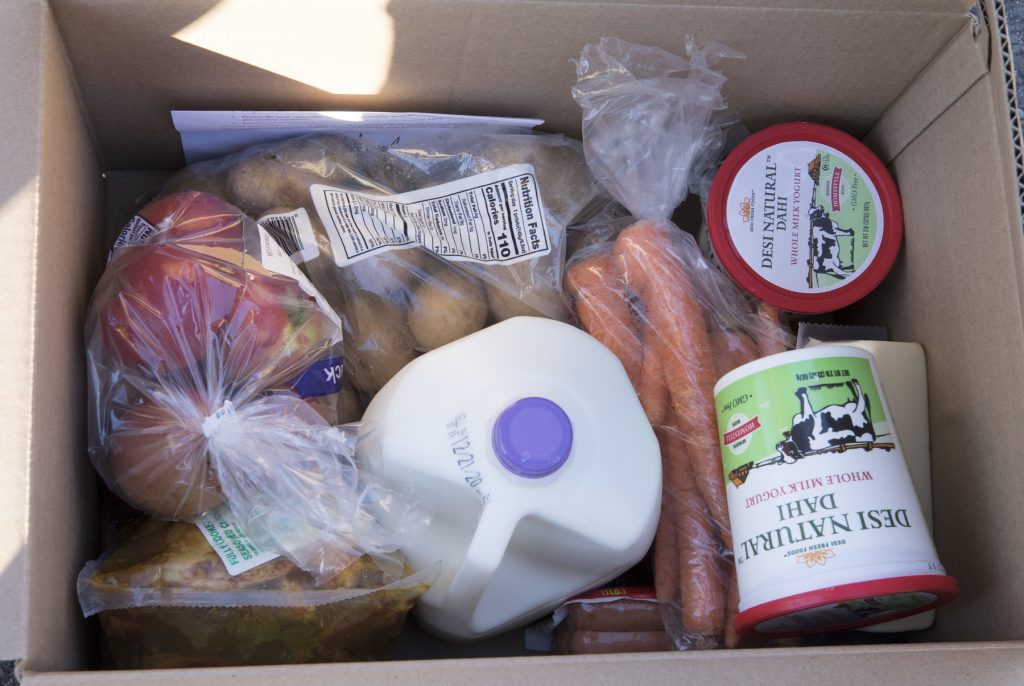 During this handout, each box contained a gallon of milk, a block of cheese, a package of hot dogs, a bag of potatoes and a bag of carrots, two containers of yogurt and a bag with seasoned chicken.