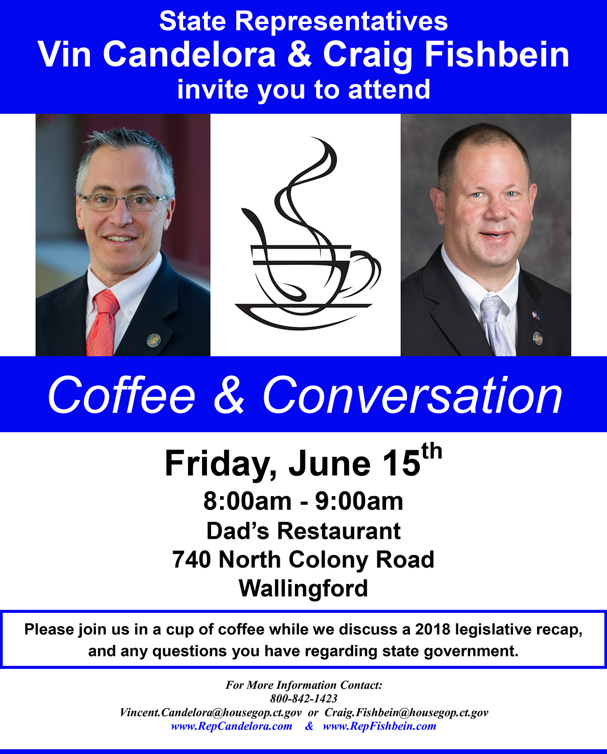 State Representatives Craig Fishbein and Vincent Candelora will be hosting a post-session Coffee & Conversation to discuss the issues that shaped the 2018 Legislative Session, the current budget, and any other items you’d like to discuss.