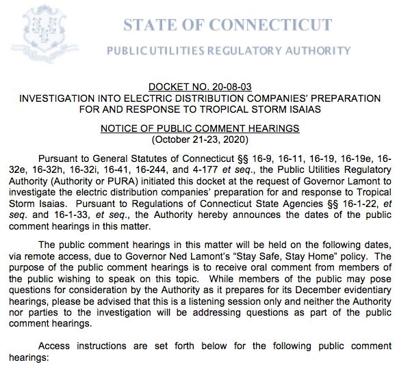 In August, PURA initiated docket 20-08-03 to review the electric distribution companies’ responses to Storm Isaias. Three public hearings have been scheduled through online Zoom calls.