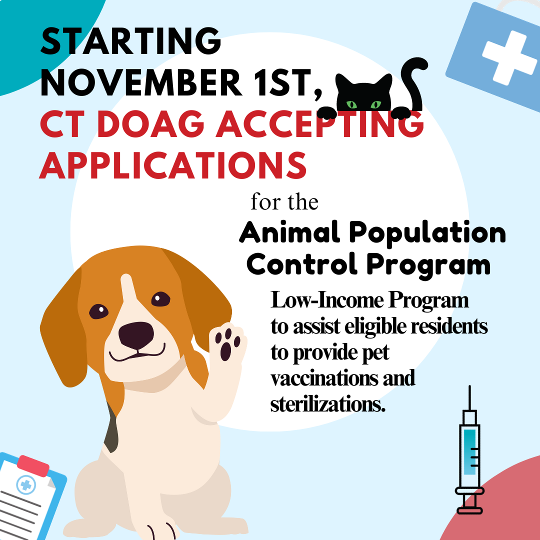 In a press release, the Connecticut Department of Agriculture (CT DoAg) announced that the Animal Population Control Program (APCP) began accepting applications for the Low-Income Program to assist eligible Connecticut residents with vaccination and sterilization of their owned pets on Wednesday, November 1, 2023.