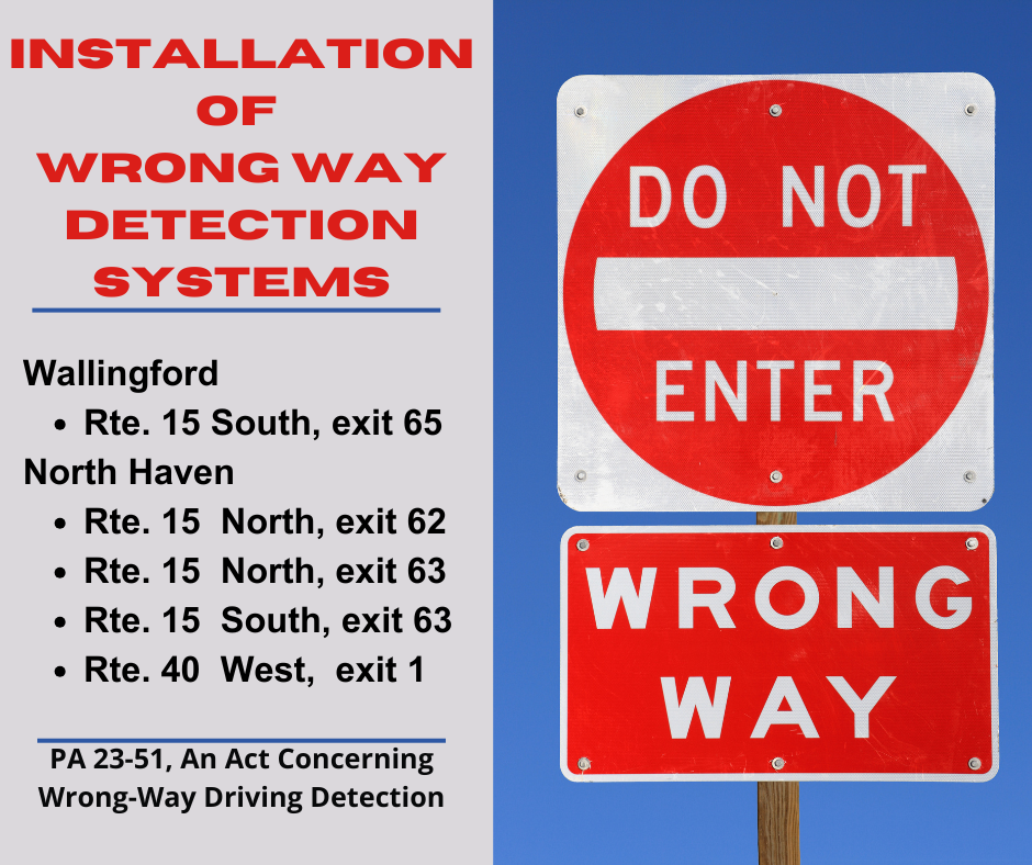 I just wanted you to know that the Connecticut Department of Transportation’s (CTDOT) Office of Engineering announced it is developing plans to install Wrong Way Driving Detection Systems on highway off-ramps considered high-risk locations for wrong way drivers. Some of these will be in or close to the district.
