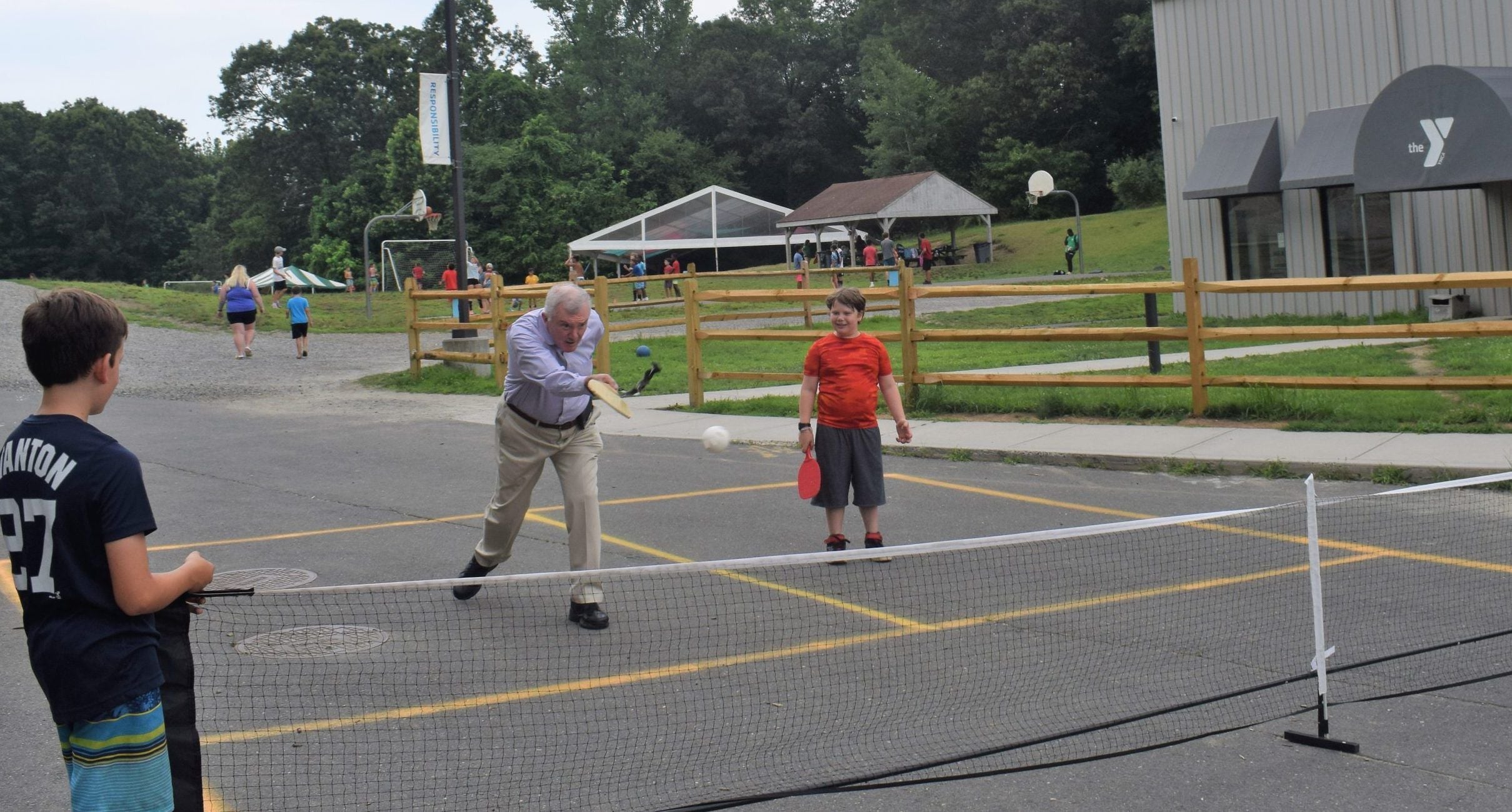 Sports offerings at Camp Greenknoll include pickleball, basketball, swimming, volleyball, and archery. There’s also a ropes course in the woods, a woodworking shop, STEAM, and arts stations, among other activities. Chaleski and Foncello each met recently with Regional YMCA of Western CT President & CEO Marie Miszewski during the day camp programming to discuss the five-year Camp Enhancement Plan.