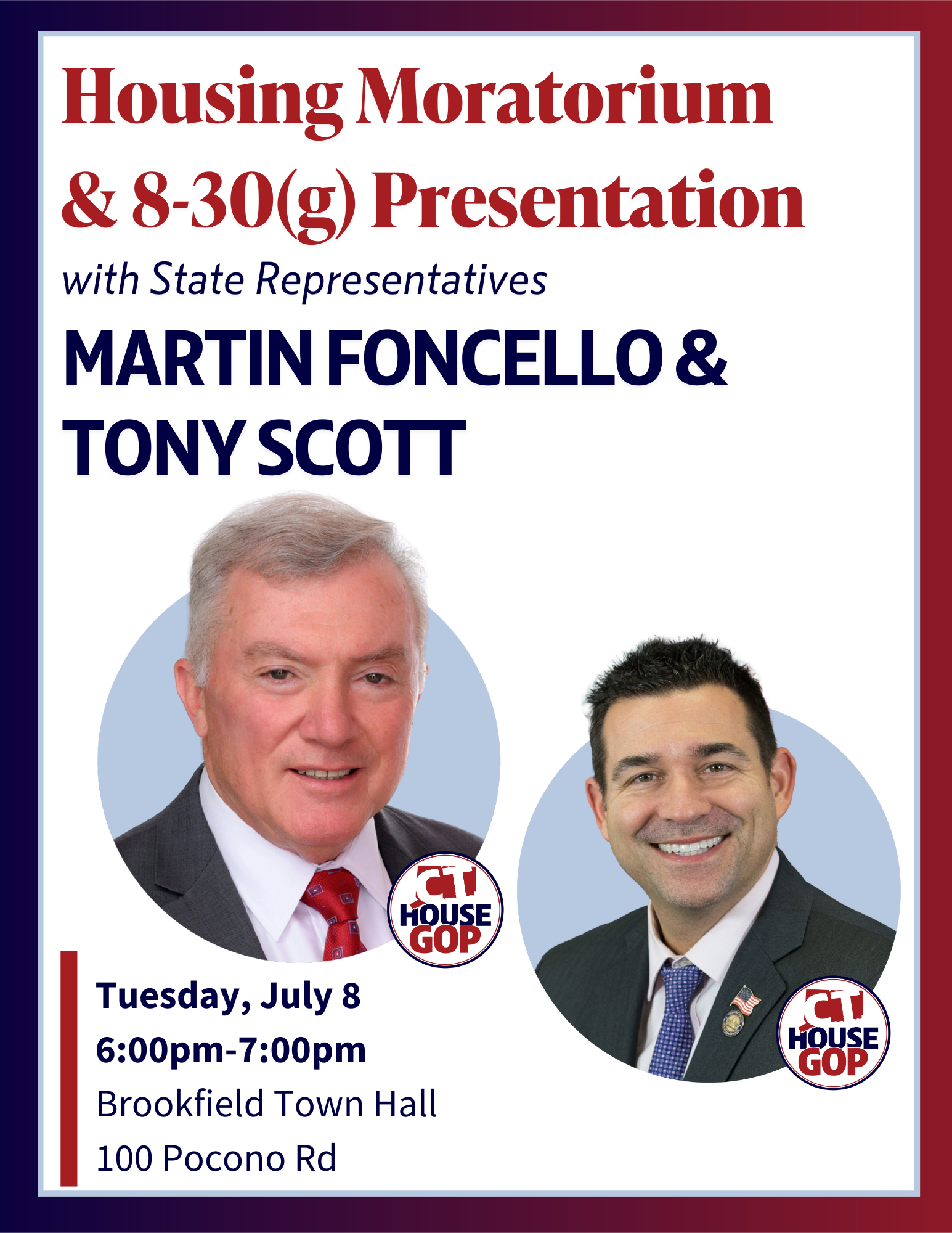 HARTFORD- Brookfield State Representative Martin Foncello (R-107) and the Ranking House Republican on the General Assembly’s Housing Committee Tony Scott (R-112) will be co-hosting a Housing Moratorium and 8-30g Presentation at Brookfield Town Hall next month.
