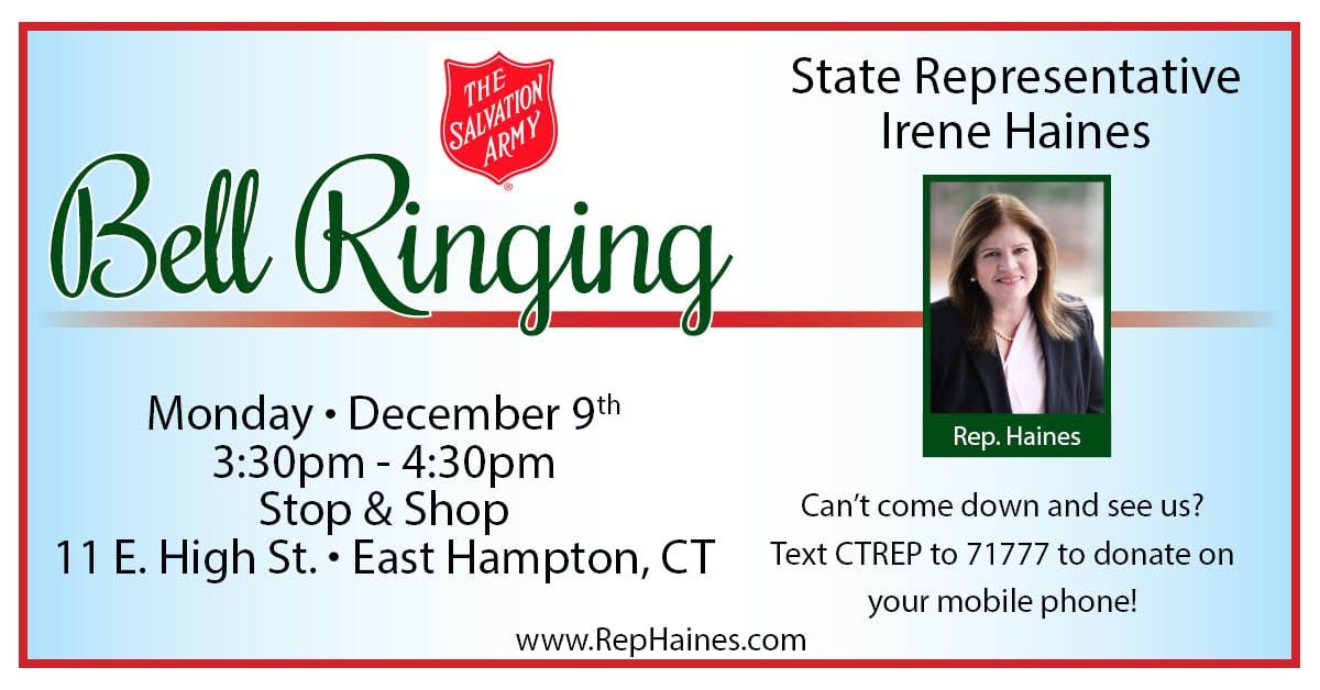 State Representative Irene Haines (R-34) will be volunteering to raise money for local residents in need by collecting for the Salvation Army at the East Hampton Stop & Shop on December 9.