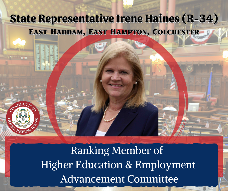 HARTFORD – On Thursday, State Representative Irene Haines (R-34) was appointed Ranking Member of the General Assembly’s Higher Education and Employment Advancement Committee by House Republican Leader-elect State Representative Vincent Candelora (R-86). The role of a Ranking Member is to serve as the leader of the minority party in committee meetings and collaborate with Committee Leadership in proposing bills and legislation.