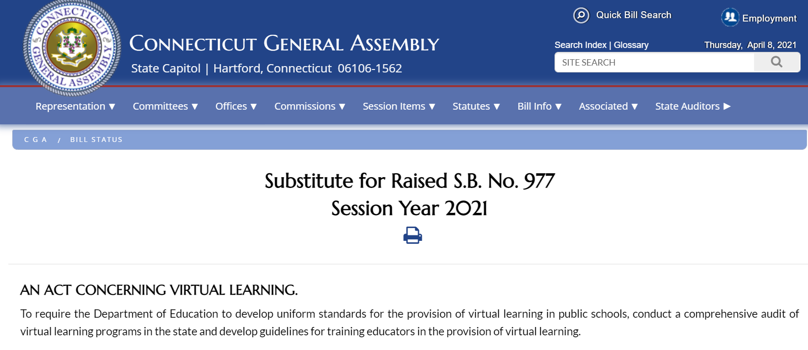An Act Concerning Virtual Learning (SB 977), would require the state Department of Education to create uniform standards for online learning by July, as well as conduct an audit of the remote learning programs being used by school districts across the state and report their findings, committee leaders said. The department would also determine what should and should not be considered an excused absence from online classes and approve the virtual learning platforms being used by districts.