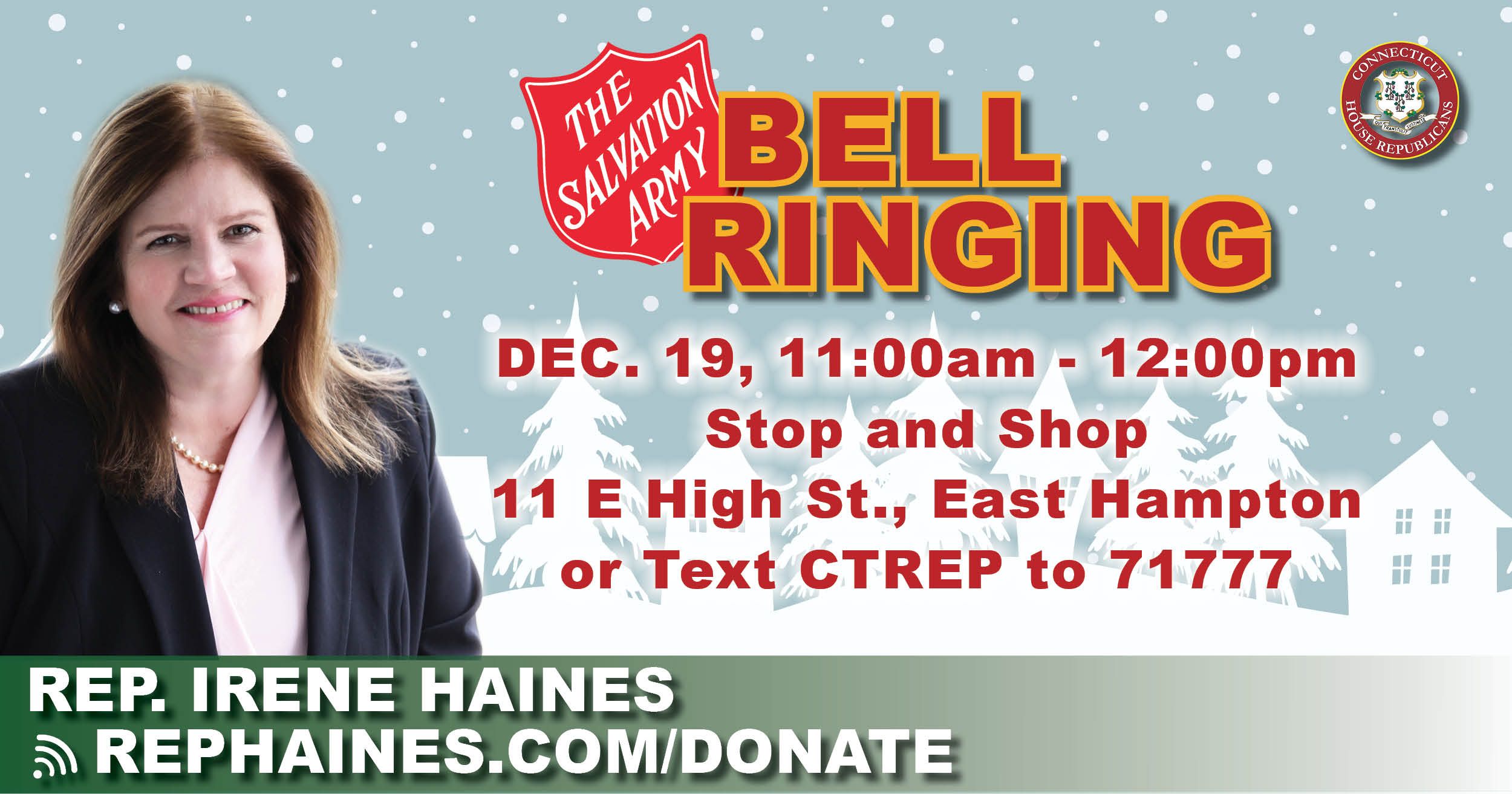 On Saturday, December 19th, I will be ringing the bell with the Salvation Army at Stop & Shop in East Hampton. Funds collected will go to help those in need in our community and across our region.
