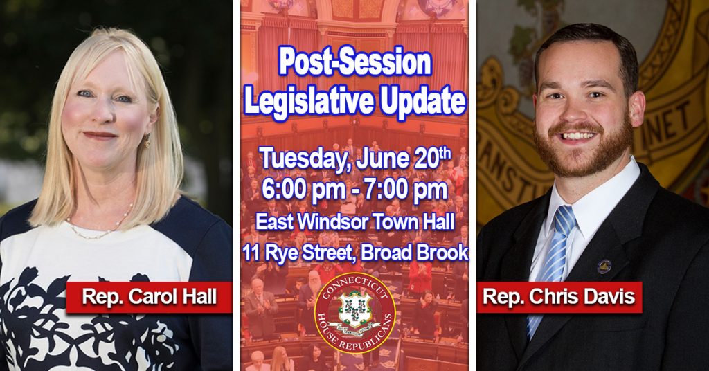 The public is invited to Post Session Legislative Update with East Windsor legislators, State Representatives Chris Davis and Carol Hall, on Tuesday, June 20th at the East Windsor Town Hall (11 Rye Street, Broad Brook). The event will run from 6:00 to 7:00 p.m.