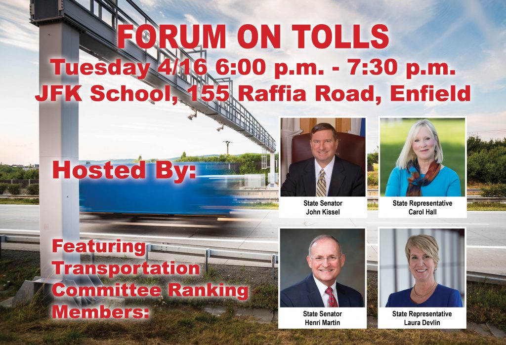 ENFIELD – State Senator John Kissel (R-7) and State Representative Carol Hall (R-59) in conjunction with State Senator Henri Martin (R-31) and State Representative Laura Devlin (R-134), House and Senate Ranking Members of the legislative Transportation Committee, are inviting the public to attend an informational forum on tolls.