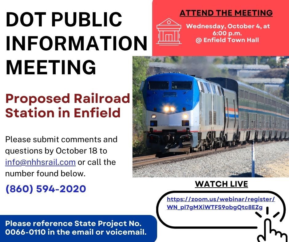 The Connecticut Department of Transportation (CTDOT) will conduct a hybrid public information meeting concerning the proposed Railroad Station in Enfield on Wednesday, October 4, at 6:00 p.m. at Enfield Town Hall at 820 Enfield St. in Enfield and virtually on Zoom and YouTube.