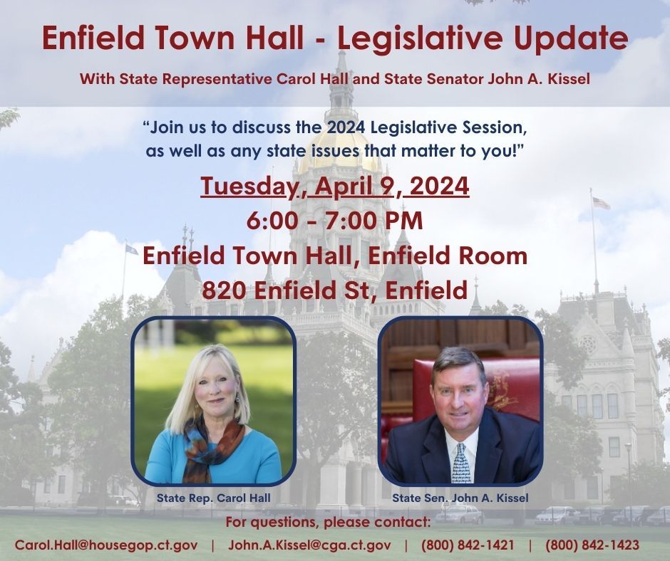 HARTFORD – State Representative Carol Hall (R-59) and State Senator John Kissel (R-7) are asking constituents in their districts to join them for Legislative Town Hall event prior to the conclusion of the 2024 session.