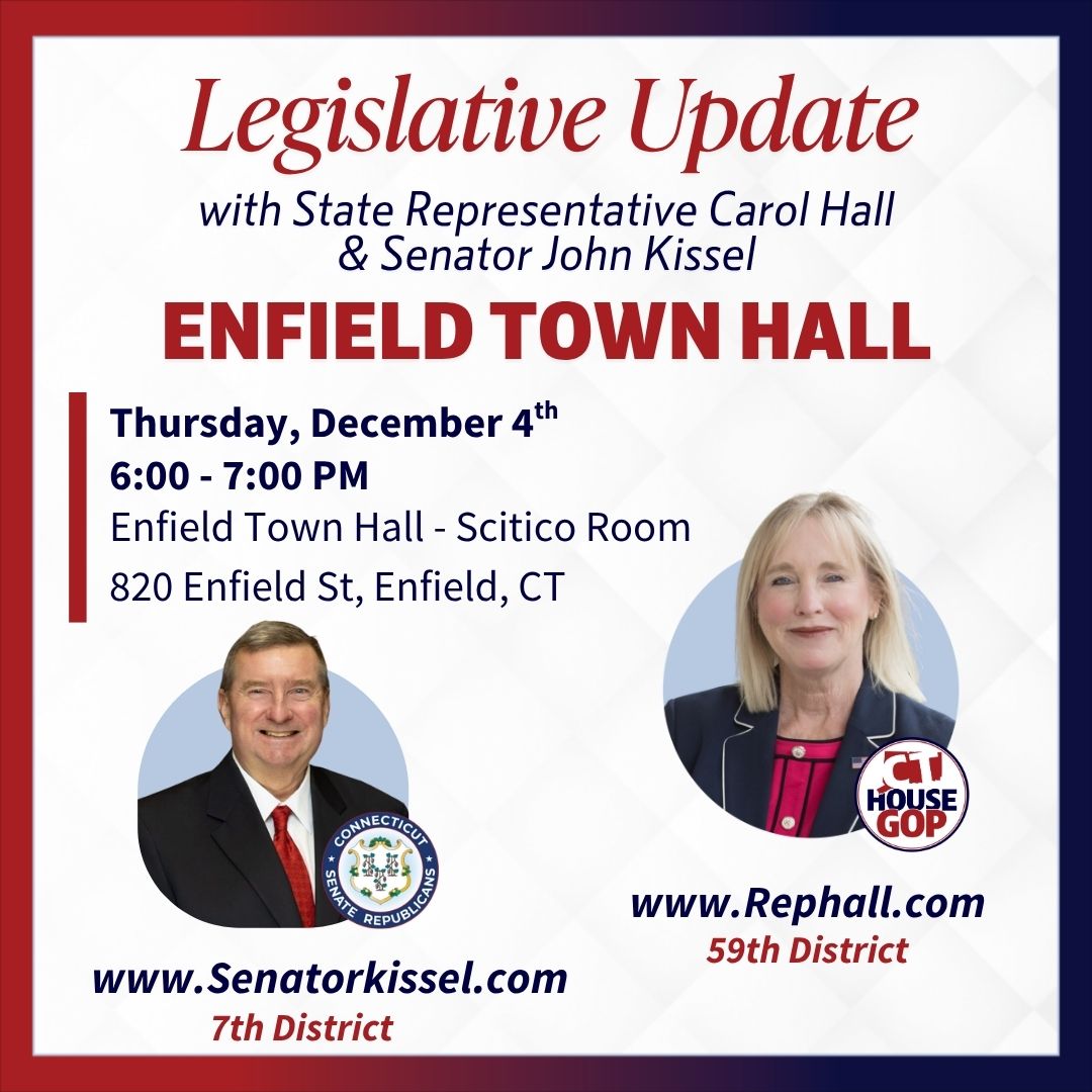 State Representative Carol Hall (R-59) and State Senator John Kissel (R-7) will be holding an upcoming Legislative Town Hall for Enfield residents who are interested in hearing from their lawmakers about the most recent special session, discussing items from the 2025 regular session, or anything else related to state government.