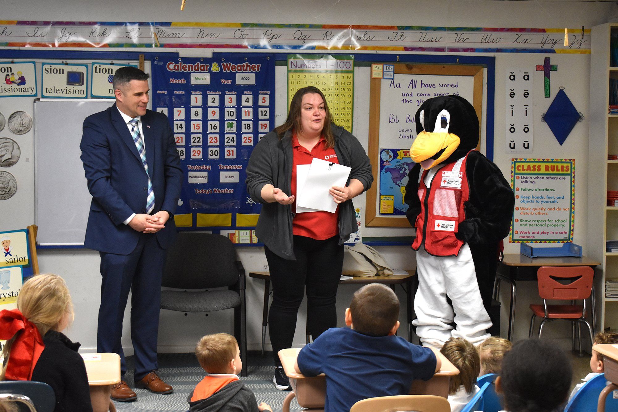 At the end of the emergency preparedness presentations, the school had a special visitor, Pedro the Penguin, who said ‘hello’ to all the students.