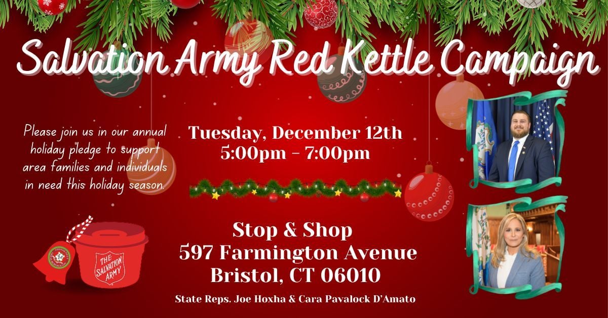 BRISTOL – Bristol State Representatives Cara Pavalock-D’Amato (77th) and Joe Hoxha (R-78th) will volunteer to raise money for in-need residents by collecting for the Salvation Army at the Bristol Stop & Shop on December 12.