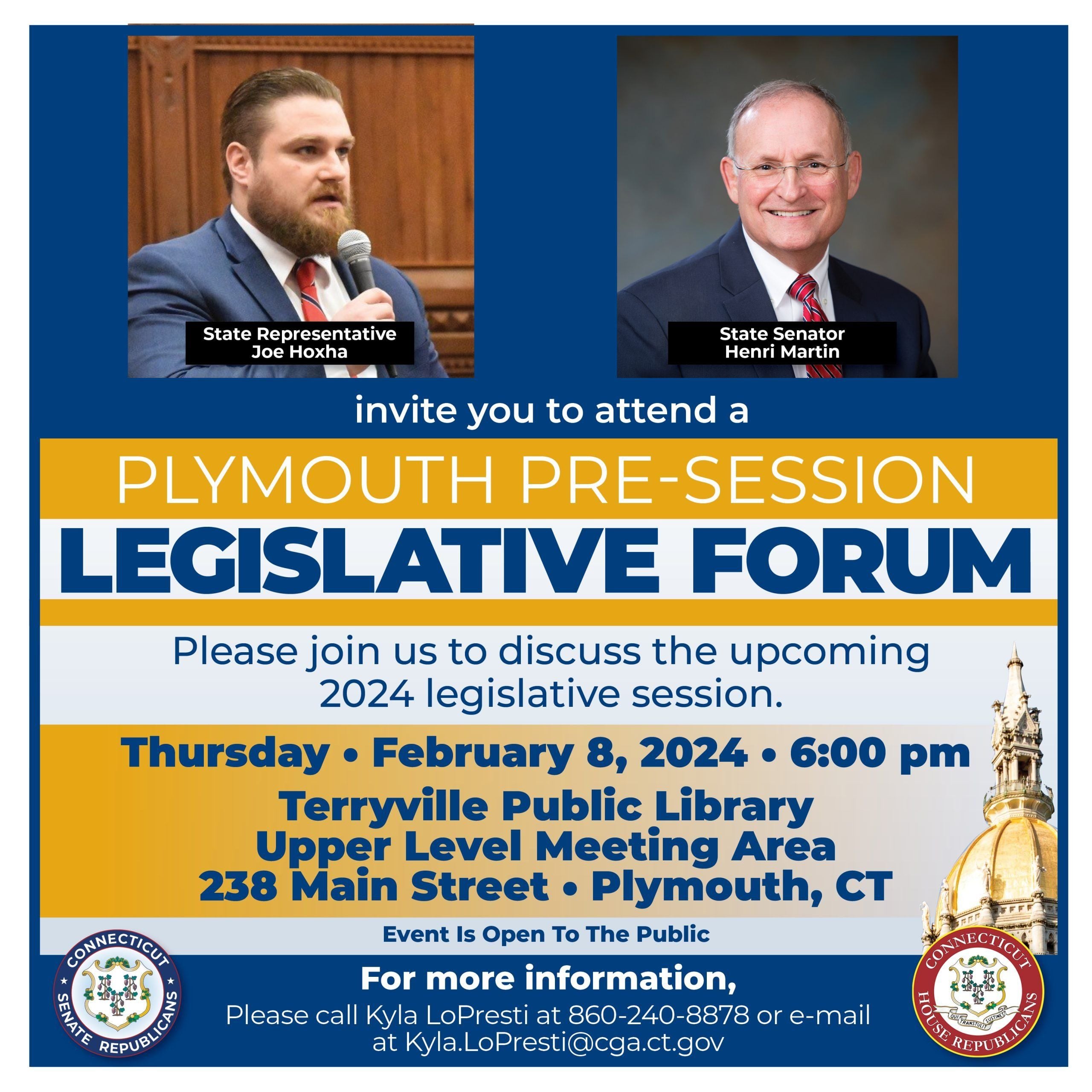 PLYMOUTH – State Representatives Joe Hoxha (R-78) and Sen. Henri Martin (R-31) would like to invite residents to join them for a Legislative Forum that is open to the public. The veteran lawmakers are encouraging anyone who has an issue related to state government to attend for a discussion about proposed legislation, budget issues, or other topics of interest to them.