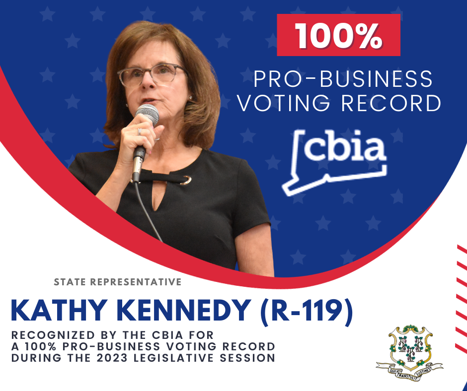 (HARTFORD) — On Monday, the Connecticut Business and Industry Association (CBIA) released their 2023 Legislative Voting Records grading General Assembly members on their support for key bills that promote local business, economic development, and a positive post-pandemic recovery. In their records, State Representative Kathy Kennedy (R-119) received a perfect score, demonstrating her commitment to business owners and our workforce throughout Connecticut.