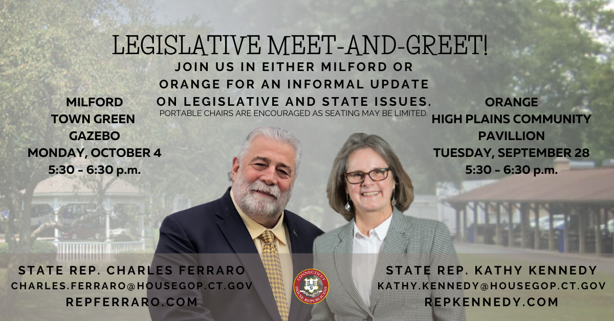 MILFORD/ORANGE- State Reps. Kathy Kennedy (R-119) and Charles Ferraro (R-118) are hosting a constituent ‘gazebo’ hour in both Milford and Orange at the end of the month to welcome in the fall season and update constituents on state issues.