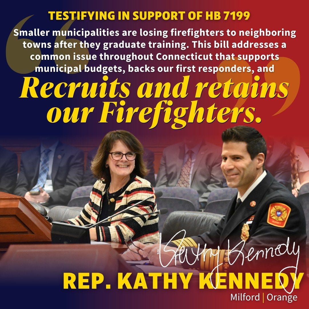 This week, I had the pleasure of testifying alongside Milford’s Fire Chief Anthony Fabrizi in strong support of House Bill 7199 which would recruit and retain firefighters within a community, especially after they graduate training. Our firefighters work tirelessly to keep us safe and it’s the least we can do for our towns to encourage the growth of our local fire department and support their careers.