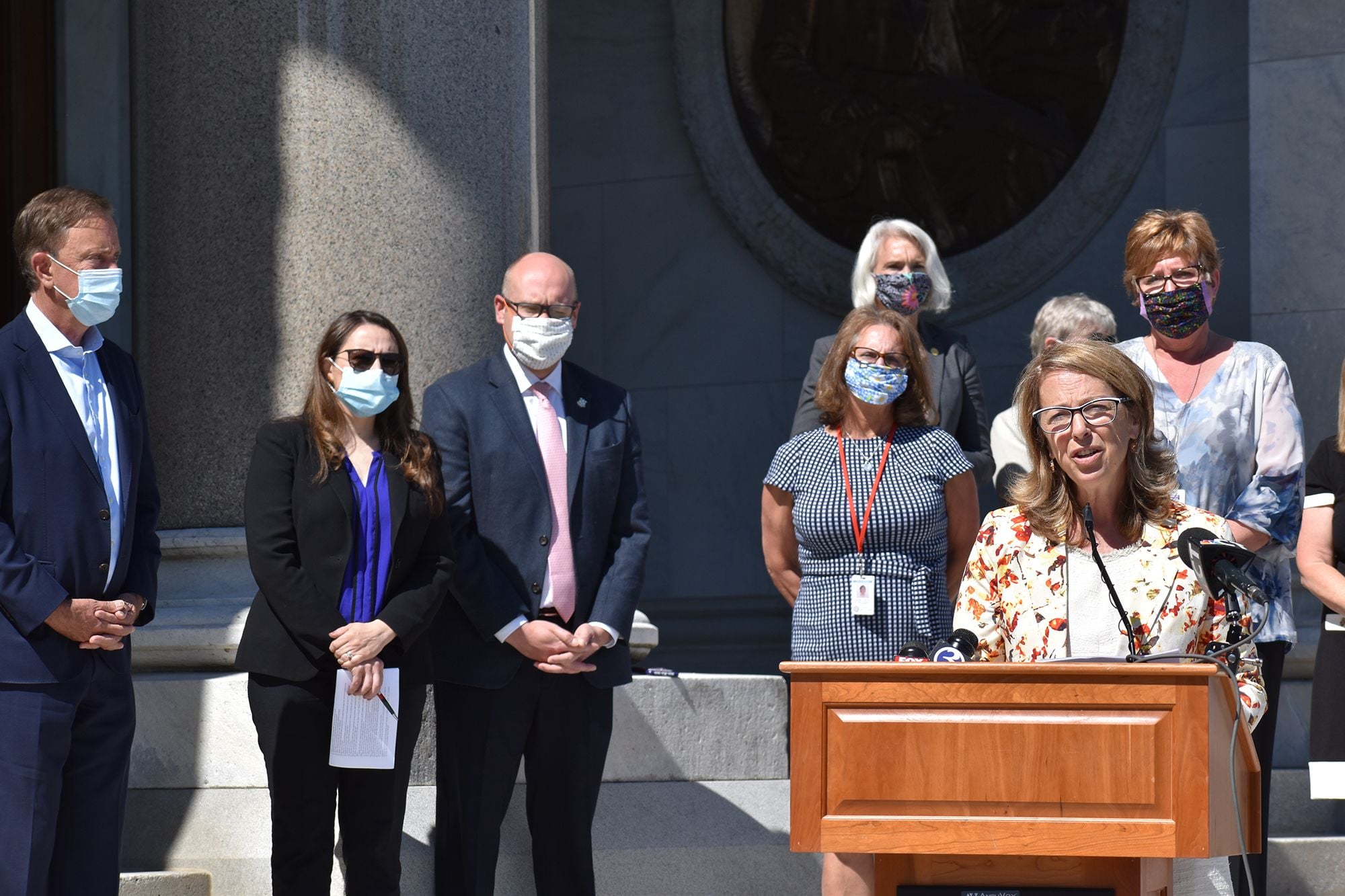 STATE CAPITOL/HARTFORD- Standing with her legislative colleagues in the bipartisan women’s caucus in front of the State Capitol with Governor Lamont at a press conference, State Rep. Kathy Kennedy (R-119) and the group discussed their work and findings on how COVID-19 has impacted nursing homes residents, their families and the nursing home front line healthcare workers across the state and to announce their recommendations.