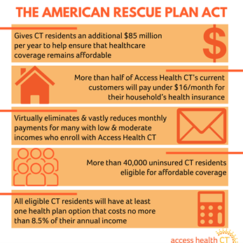 The American Rescue Plan Act of 2021 (ARP) will make health insurance coverage more affordable and accessible for many Connecticut residents during the current health crisis, by virtually eliminating or vastly reducing monthly payments (premiums) for many people with low and moderate incomes who enroll through Access Health CT; and providing new financial help for people with somewhat higher incomes who can face high premiums.