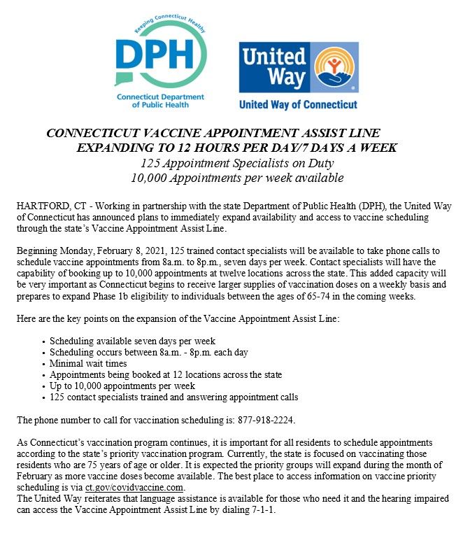 CONNECTICUT VACCINE APPOINTMENT ASSIST LINE EXPANDING TO 12 HOURS PER DAY/7 DAYS A WEEK