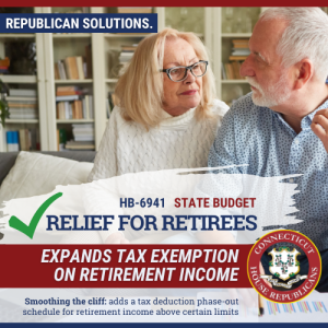 Connecticut seniors are supported in the budget agreement, which eliminates the benefits cliff on their pension and annuity income or individual retirement accounts. The plan phases out the income tax exemption on those earnings post-retirement gradually by raising the income threshold from $100k to $150k for joint filers and $75k to $100k for single, separate, and head of household filers.