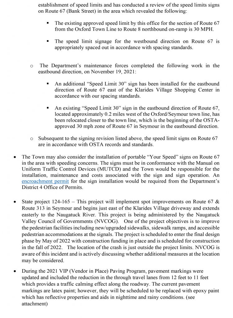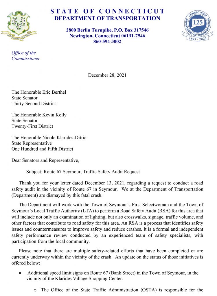 I want to thank Commissioner Giulietti and the DOT for quickly acknowledged the need for a road safety audit and committing to work with the town to review the Route 67 area. As they note in their response to our request, some improvements are currently being put into place to calm traffic, reduce speeds and increase visibility.