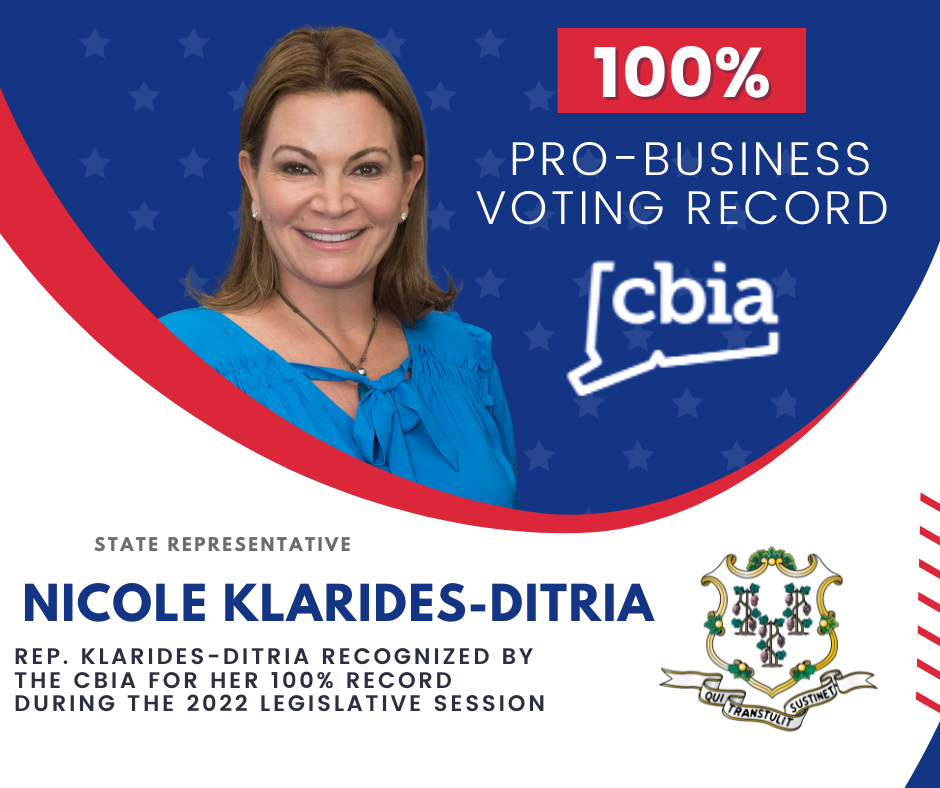 Connecticut’s largest business organization recognized State Representative Nicole Klarides-Ditria for her perfect voting score on key bills impacting Connecticut’s economic growth and business climate during the 2022 legislative session.