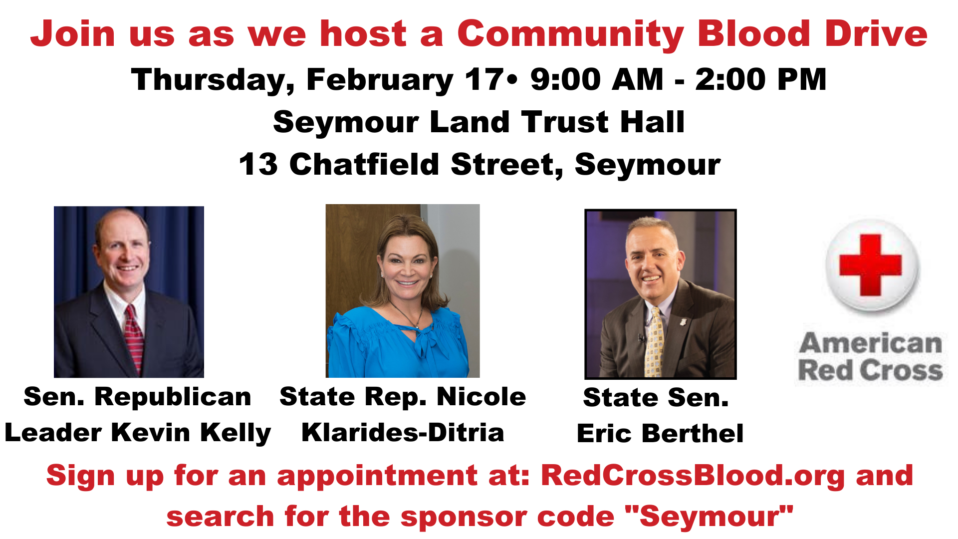 State Representative Nicole Klarides-Ditria (R-105) and State Senate Republican Leader Kevin Kelly (R-21) and State Senator Eric Berthel (R-32) are asking the community to join them during an American Red Cross Blood Drive at the Seymour Land Trust Hall on Thursday, February 17.